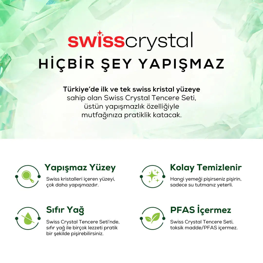 SwissCrystal Surface: Turkey's first and only cookware set produced with Swiss crystals, Karaca SwissCrystal Cookware Set, has superior non-stick properties.